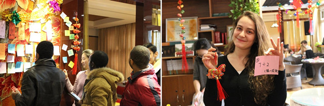 猜燈謎游戲吸引了不少同學的眼球,來自世界各國的學生們第一次見識了中國傳統燈謎,他們開動腦筋,積極參與到其中,也體味著中國的文化。猜中的學生自豪地向大家展示著謎底及得到的小禮物。