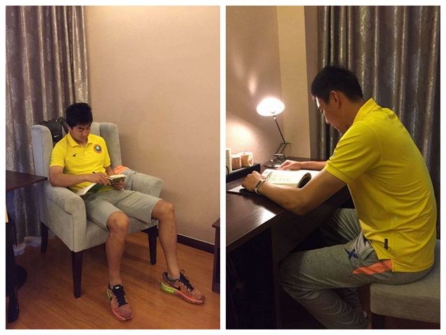 每年的六、七月,是各級比賽的緊張階段,而讓學生球員們更有壓力的則是北理工的“考試周”同樣來臨。6月4日,在前往武漢參加中甲聯賽的路上,隨處可見捧著書本苦讀的學生球員們,已經是職業聯賽場上主力的2013級研究生胡明也是其中之一。“比賽結束之后,我們《品牌管理》這門課就要進行結課考試了,沒辦法集中復習,只能抽空復習了。”胡明告訴我們,這種狀態同學們已經習以為常,遇到考試周與比賽重合,學生球員們都會抓緊路途上的時間學習,到達駐地之后就“悶”在賓館里,備戰回校后的考試。學習是一名學生的職責,大學生球員們不能耽誤,他們比普通學生要流淌更多的汗水,學業與足球,一個都不能少,也沒有少。
