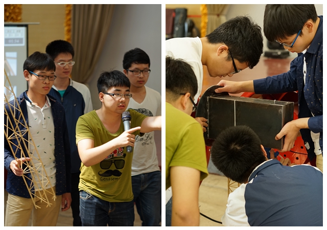 競賽要求參賽選手用給定的竹皮和502膠兩種材料設(shè)計、制作一個縮小版的風(fēng)力發(fā)電塔架結(jié)構(gòu)。我校選手在指導(dǎo)教師白若陽和帶隊教師張強的指導(dǎo)下,精心設(shè)計、制作出了既符合承載要求又擁有精美外觀的作品,并在答辯環(huán)節(jié)獲得了評委會的一致好評。