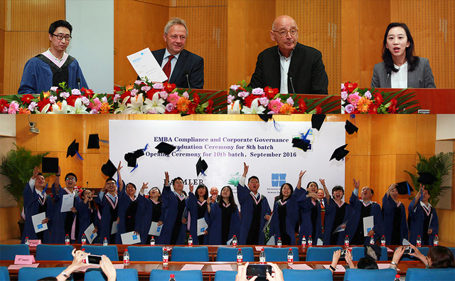 2016年9月2日下午, 北京理工大學與德國康斯坦斯應用科學大學合作為國際著名奔馳汽車生產商戴姆勒公司舉辦的EMBA項目第八期畢業典禮暨第十期新生開學典禮在我校國際教育交流大廈三層報告廳隆重舉行。出席此次開學典禮的嘉賓有:北京理工大學校長助理龍騰教授、戴姆勒大中華區投資有限公司首席財務官Karl Deppen先生、戴姆勒大中華區投資有限公司人力資源部總經理滿靜女士、康斯坦斯應用科學大學繼續教育部主任Roland Luxemburger先生、Josef Wieland博士、我校國際交流合作處副處長邢清清副教授、國際教育學院梅文博院長、蔣志湘副院長。典禮由梅文博院長主持。