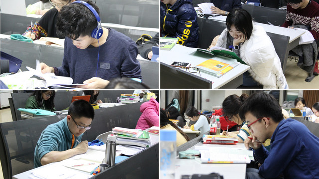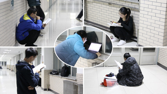 教室里容不下了,他們就在大廳,在走廊,撐起桌子,支起凳子,討論、記誦。只要有燈的地方,就有他們的身影,他們的勤奮刻苦互相照映,又像一盞盞明燈。