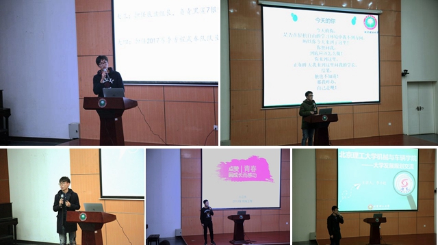 主論壇及開幕式于12月12日在良鄉校區綜合教學樓報告廳舉行,報告廳內座無虛席。活動邀請優秀科創車隊代表李桐、徐特立獎學金獲得者李小松、學生干部代表宋洛、青春榜樣孫嘉偉以及學習優秀代表任棚等五位學生代表分享各自的大學生活。從不同角度鼓勵低年級學生樹立自信心,合理自我定位、做好規劃,積極主動地挖掘和利用校內外資源與平臺,全面促進、提升個人的成長與發展。