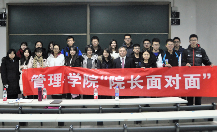 編輯:嚴(yán)箐 審核:仇芳 閱讀次數(shù):為系統(tǒng)落實(shí)“一年級(jí)工程”,在2016級(jí)新生中樹(shù)立專業(yè)學(xué)習(xí)意識(shí),建設(shè)嚴(yán)謹(jǐn)求實(shí)學(xué)風(fēng),貫徹學(xué)校“高遠(yuǎn)的理想,精深的學(xué)術(shù),強(qiáng)健的體魄,恬美的心境”育人目標(biāo),2016年12月29日晚六時(shí)三十分,北理工管理與經(jīng)濟(jì)學(xué)院開(kāi)展了院長(zhǎng)面對(duì)面活動(dòng),院長(zhǎng)魏一鳴受邀出席本次活動(dòng)。管院輔導(dǎo)員張瑞、莊杰、賈一寧與管院全體大一新生以及部分大二、大三學(xué)生參與了本次活動(dòng)。魏一鳴院長(zhǎng)以《管理學(xué):科學(xué)與藝術(shù)》為題,結(jié)合自己多年的研究經(jīng)驗(yàn),用生動(dòng)的例子讓同學(xué)們深入了解了管理學(xué)嚴(yán)謹(jǐn)?shù)目茖W(xué)性和獨(dú)特的藝術(shù)性,并為同學(xué)們梳理了專業(yè)課程知識(shí)脈絡(luò)的學(xué)習(xí)發(fā)展方向,與同學(xué)們就一些疑問(wèn)展開(kāi)了深入的探討。