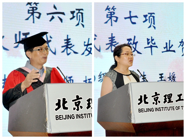 本科生考沙爾·麥爾阿木與研究生留學生皇馬則作為各自畢業生代表發言。考沙爾·麥爾阿木則用四年的法學專業學習與學生活動經歷懷念即將結束的大學生活;皇馬則全英文地表達了作為留學生來到中國學習的榮幸、作為留學生的文化、學術交流的橋梁作用以及對北理法學院培育的感激之情。