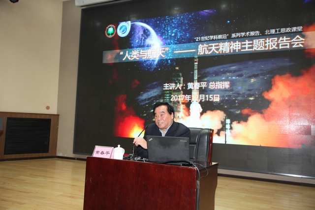 為培養學生熱愛航空航天事業的興趣和“特別能吃苦,特別能戰斗,特別能攻關,特別能奉獻”的航天精神,樹立報效祖國航空航天事業的遠大理想,2017年12月15日,北京理工大學宇航學院特別邀請我校杰出校友、長征二號F火箭總指揮黃春平研究員作“人類與航天”——航天精神主題報告會。北京理工大學副校長王曉鋒,原校紀委書記張敬袖,宇航學院黨委書記曲虹,副院長孫程、龍騰及部分教師代表出席了報告會,230余名學生參加了報告會。報告會由宇航學院黨委副書記、副院長方蕾主持。