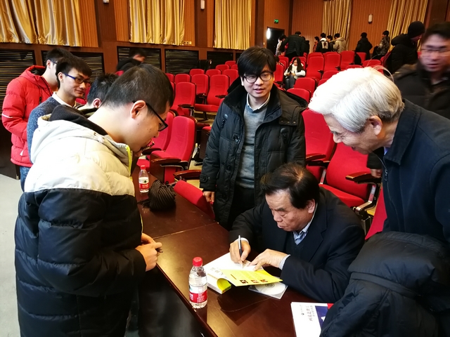 報告會結束后,與會師生紛紛上前請黃春平簽名,黃春平也親切地同師生合影留念。