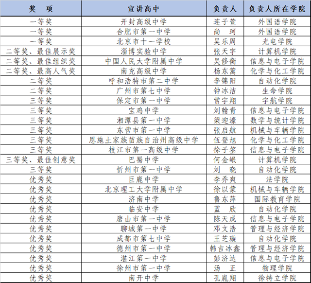 經過學院推薦,招生辦公室、校團委初審,共有27支團隊從近900支團隊中脫穎而出,進行“思源”專項計劃答辯。各實踐團隊代表從前期準備、宣講內容、宣傳報道、后期跟進、實踐感悟等多個方面進行實踐成果展示;評委就招生宣講的具體情況及可完善之處進行了提問交流。經過評審,外國語學院連子萱赴開封高級中學等三支團隊獲得一等獎,信息與電子學院吳修衡赴中國人民大學附屬中學等五支團隊五支團隊獲得二等獎,機械與車輛學院張啟航赴東營市第一中學等十九支團隊獲得三等獎及優秀獎。另外,通過線上投票及現場評審,化學與化工學院楊東籬赴南充高級中學等四支團隊分別獲得最高人氣獎、最佳展示獎、最佳創意獎和最佳組織獎。