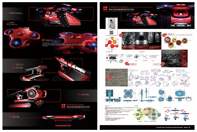 設計說明:該裝備的設計研究,實現了裝備的多功能性,包括水力滅火、風力滅火、化學滅火以及火場勘察和數據收集傳輸功能,系列產品包括履帶式勘察車、背負式滅火水槍、改良型風力滅火器、火場勘察無人機、肩負式化學滅火彈(發射器)以及穿戴式裝備控制器。履帶車與滅火水槍、風力滅火器、無人機和化學滅火彈(發射器)可組合形成不同滅火機器人。整個系列產品可根據具體林火情況進行裝備配置與組合。
