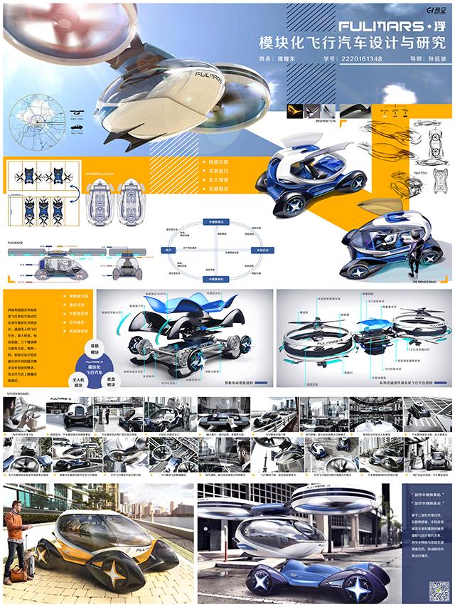 設計說明:基于未來城市交通構建三維網絡,將共享汽車的自主性連接性植入到空中交通系統中,和傳統的地面二維交通交織呼應,為城市中短途通勤提供新的解決方案。創新性地提出,“城市中繼換乘站”和“城市中繼換乘點”概念。共軸反旋涵道螺旋槳飛行器載荷平臺和智能電動底盤模塊搭載中間獨立艙體,三大模塊兩大部分可應對城市陸空各種狀況。通過后臺大數據智能調控,根據不同路況不同區域匹配對應空中飛行模塊或地面汽車模塊切換,使乘客無縫對接換乘模塊,確保在擁堵路段前實現模式切換順暢通過。雙人縱置布局,無人駕駛通過性更強。根據涵道飛行器的技術優勢使得飛行汽車能隨時起降,且接觸安全性提升,不同數量涵道組合能提供更多載荷搭配可能,使涵道平臺和飛行汽車的用途更加廣泛。