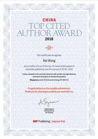 日前,材料學院曹茂盛教授收到英國皇家物理學會(IOP)發來的賀信,其指導的博士生盧明明和王希晰以共同第一作者身份發表在Nanotechnology(2016, 27, 065702)的文章“Carbon nanotube-CdS core–shell nanowires with tunable and high-efficiency microwave absorption at elevated temperature”入選“2018年英國皇家物理學會(IOP)高被引作者獎 (中國)”,IOP出版集團向獲獎論文通訊作者和兩位共同第一作者頒發了榮譽證書,這是英國皇家物理學會(IOP)首次授予中國科技工作者此項榮譽。
