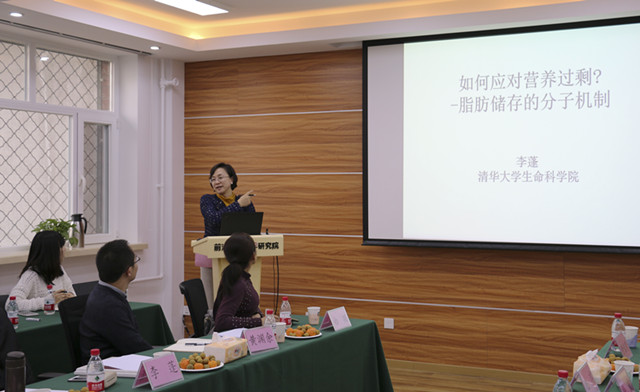 李蓬院士作了題為《如何應對營養過剩-脂肪儲存的分子機制》的報告。報告中她提出,脂類物質包括脂肪、磷脂、膽固醇等參與膜結構和能量代謝的重要分子。中性脂肪甘油三酯(TAG)是細胞內能量的主要來源。在食物充足的條件下,攝入的能量以脂肪的方式儲存于脂肪組織中。脂肪主要儲存于脂滴中,脂滴作為能量儲存的細胞器,在細胞脂穩態調控中起重要作用。CIDE 家族蛋白是脂滴和內質網結合蛋白,可調節脂肪細胞,肝臟細胞,皮脂細胞和乳腺細胞等多種細胞中脂肪的儲存,分泌,降解等多個過程。在分子機制上,CIDE家族蛋白可在脂滴與脂滴結合處富集,形成類似孔狀的結構,促進脂滴間脂的流動,通過脂滴之間的壓力差,引起小脂滴的脂肪定向向大脂滴流動,最終導致脂滴的融合和生長。調節脂滴融合的蛋白,如Perlipin1,Rab18和AS160 等可通過與CIDE的相互作用調節脂滴融合的速度和效率;脂肪酸可通過正反饋調節脂滴的融合和脂肪的儲存。研究發現了調控脂肪儲存和代謝性疾病發生的一條新途徑。