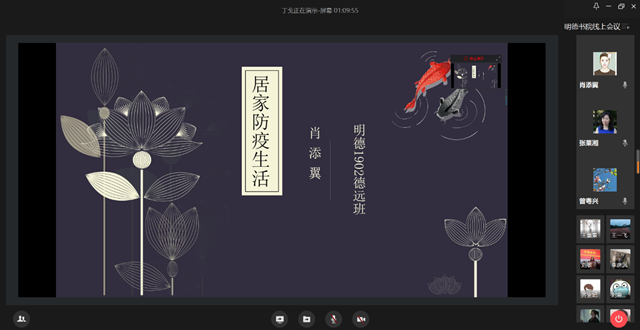 同學們依次分享了在疫情期間的居家生活、學習情況和成長收獲,并對網絡教學環節、學生活動等方面提出意見和建議。同學們以高度的學習熱情投入到線上學習的同時,也養成了一些良好的習慣,如日常鍛煉、培養良好生活技能等。黃思旅表示,當學習熱情有所下降時,她會采取和同學一起結伴學習、互相督促的方式,取得了良好效果。朱宇瑋談到,在學習生活之余,她積極從事了志愿服務工作。
