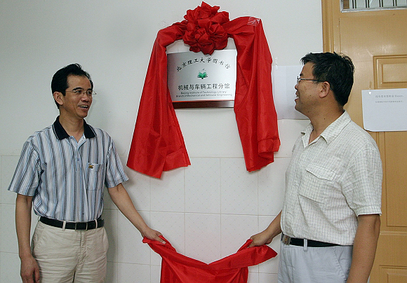 2007年7月23日下午,“北京理工大學(xué)圖書館機械與車輛工程分館”掛牌儀式在機械與車輛工程學(xué)院舉行。校黨委副書記趙平(右)、副校長孫逢春(左)參加了掛牌儀式并共同為“北京理工大學(xué)圖書館機械與車輛工程分館”揭牌。參加掛牌儀式的還有機械與車輛工程學(xué)院院長項昌樂、常務(wù)副書記張英、副書記兼副院長郝洪濤、副院長胡紀(jì)濱、副院長左建華,圖書館館長張永發(fā)、副館長馬宏偉、辦公室主任張靜,儀式由副館長馬宏偉主持。