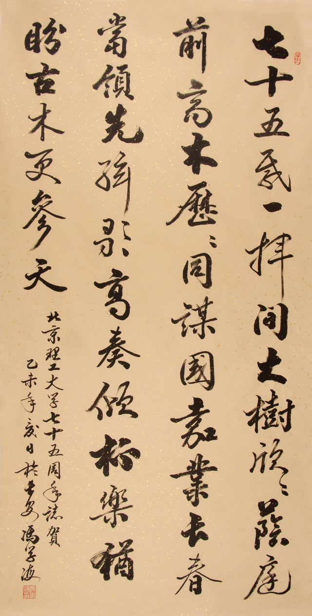 馮老師目前供職于西北兵工局,日常工作繁忙,但他把書法作為一種很好的休息方式。告訴我們要處理好日常生活的五個關(guān)系,上班下班的關(guān)系、業(yè)余與工作的關(guān)系、緊張與輕松的關(guān)系、左腦與右腦的關(guān)系、量變與質(zhì)變的關(guān)系。他教育我們書法一定要給他人帶來美感,同時告誡青年學子從傳統(tǒng)文化中汲取營養(yǎng),“可以寫不出,但是要懂欣賞書法藝術(shù)的美”。采訪最后,他為母校75歲生日賦詩一首以表對母校的感恩與祝福:“七十五載一揮間,大樹欣欣蔭庭前,高木歷歷同謀國,嘉業(yè)長春當領(lǐng)先,絃歌高奏傾杯樂,猶盼古木更參天。”
